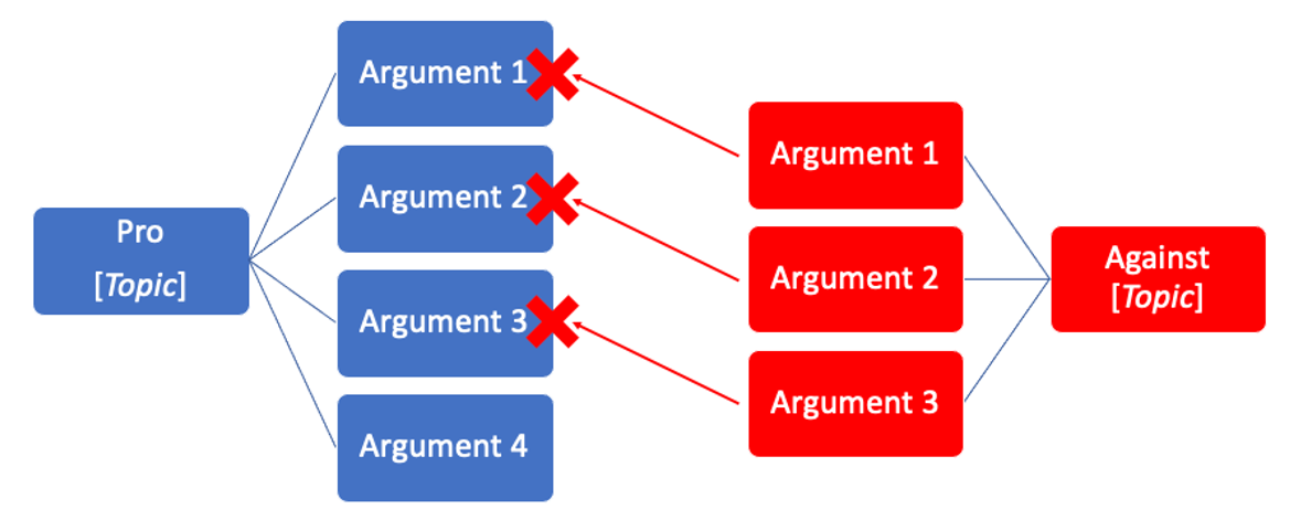 But by all means – let’s tackle the complexities of human existence in the 22 minutes between commercials of a half-hour show, where there isn’t nearly enough time to delve into the nuances of any particular topic. Crossfire, as aired, was never going to produce a clear-cut winner, but it could have, if it were structured in a way that produced meaningful dialogue. Ideally, one could chart out the arguments on each side of the debate resulting in a diagram that looks like: