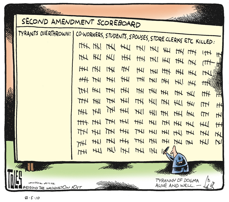 Note that Tom Toles created this cartoon 13 years ago. We’ve now got multiple billboards full of scratch marks on the right, and still no overthrown tyrants on the left. So, what are we, as a nation founded on a constitution featuring the Second Amendment to do?